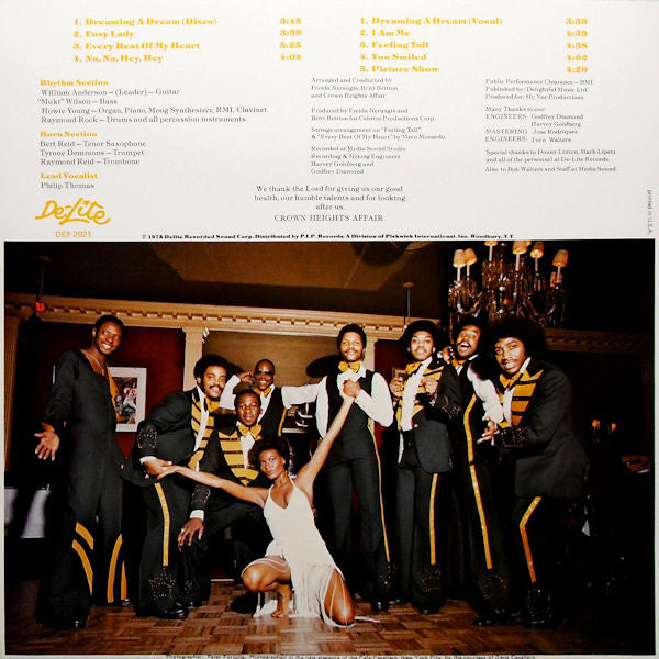 Retitled 1976 reissue of DEP-2017, "Dreaming A Dream", with remixed and retitled version of track A2. Printed in U.S.A. Produced [... for Cabrini Productions Corp. Recorded at Media Sound Studio Public performance clearance - BMI Published by: Delightful Music Ltd. Produced for: Mr. Vee Productions ℗ 1975 Delite Recorded Sound Corp. Distributed by PIP Records - A division of Pickwick International, Inc. Woodbury, N.Y. Photographed in the new elegance of the Cafe Cavallero, New York City, by the courtesy of Gene Cavallero The New York Sound Catalog numbers: DEP 2021 - Front, back, labels DEP-2021 - Spine