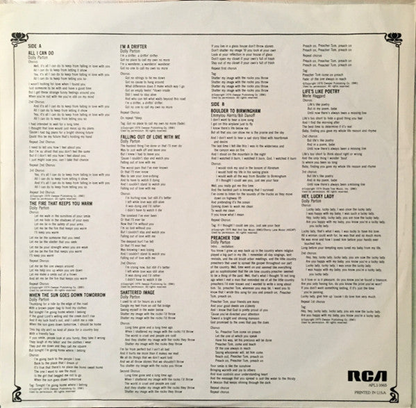 Recorded in RCA's "Nashville Sound" Studios, Nashville, Tennessee Art director: Herb Burnette, Pinwheel Studios "Visit the Country Music Hall of Fame, Nashville, Tennessee." TMK (S) ® Registered • Marca(s) Registrada(s) RCA Corporation © 1976 RCA Records, New York, N.Y. • Printed in U.S.A. - back cover TM(s) ® RCA CORP.-Made in U.S.A. ℗ 1976 RCA RECORDS ℗ 1975 RCA Records - labels RCA Records Pressing Plant, Indianapolis pressing denoted by "Ⅰ" stamp in runouts.