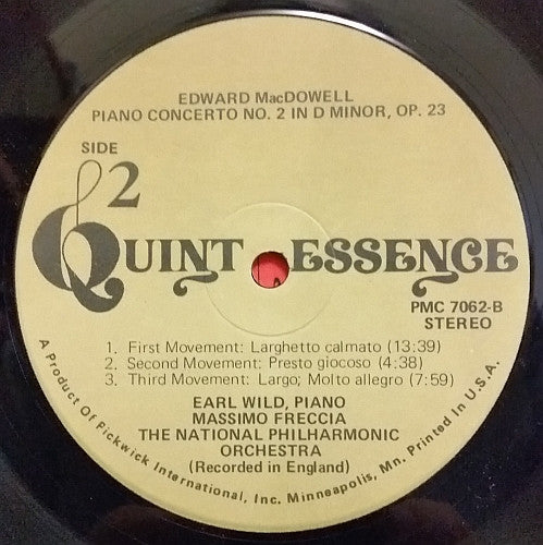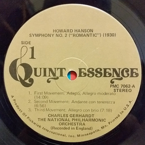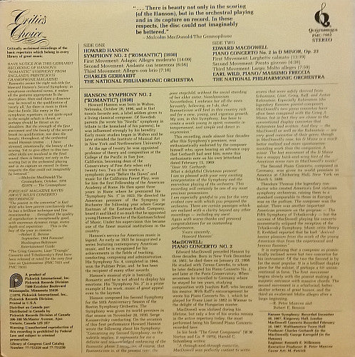 Hanson's Symphony was recorded December 18, 1967 at Kingsway Hall, London. MacDowell's Concerto was recorded February 14, 1967 at Walthamstow Town Hall. Quintessence is a product of Pickwick International, Inc. Pickwick International, Inc. has a copyright date of 1978. The Library of Congress Card Catalog Number is dated 1977 (77-751229 and 77-751230).