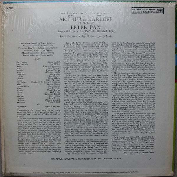 James Matthew Barrie - Jean Arthur, Boris Karloff, Leonard Bernstein - Peter Pan (LP, Album) (Near Mint (NM or M-))