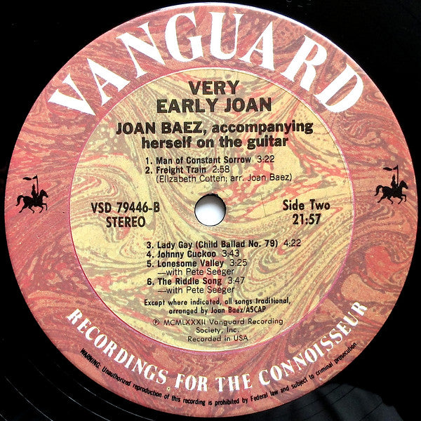 "Joan Baez, accompanying herself on the Guitar" noted on labels. "Never previously released! 24 superb performances by Joan Baez recorded during her concert tours of 1961-1963. Including 2 duets with Pete Seeger" is noted on the front cover.