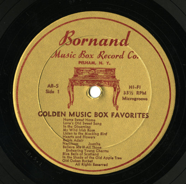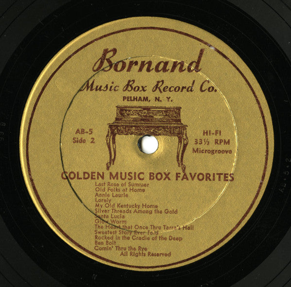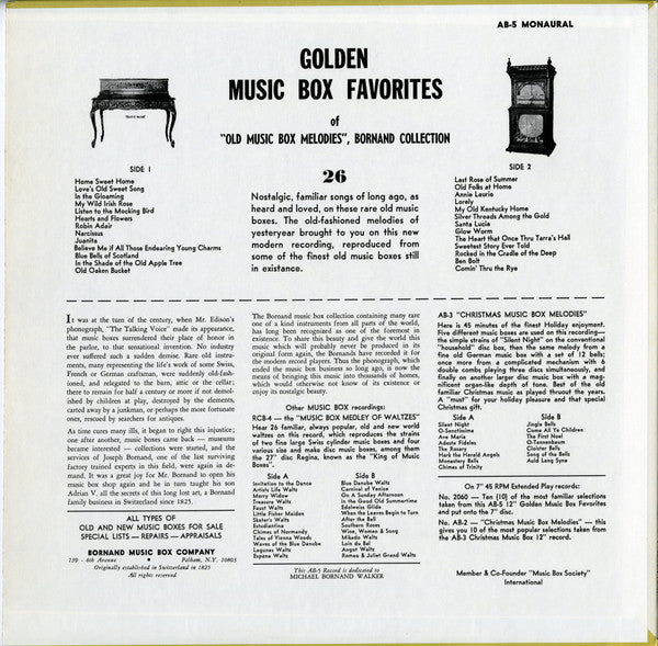 Title as given on front cover is "Original Authentic Beautiful Golden Music Box Favorites: 26 Nostalgic 'Well Loved' Familiar Melodies", as "Golden Music Box Favorites of 'Old Music Box Melodies', Bornand Collection" on back cover, and as "Golden Music Box Favorites" on labels. "This AB-5 Record is dedicated to Michael Bornand Walker"