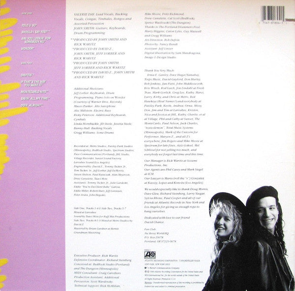 Recorded at: Metro Studios, Paisley Park Studios (Minneapolis); BedRock Studio, Spectrum Studios, Pace Communications (Portland); JHL Studio, Village Recorder, Sunset Sound Factory, Larrabee Sound (Los Angeles). Tracks A1 to B3 Mixed at Larrabee Sound for Ruff Mix Productions Tracks B4 & B5 Mixed at Metro Studios All songs published by Poolside Music, Inc., BMI. ℗ © 1988 Atlantic Recording Corporation for the United States and WEA International Inc. for the world outside of the United States. Dedicated with love to our friend David Chance. Promotional copies of this release may contain a Nu Shooz color folder with two black/white photos and publicity sheet insert.