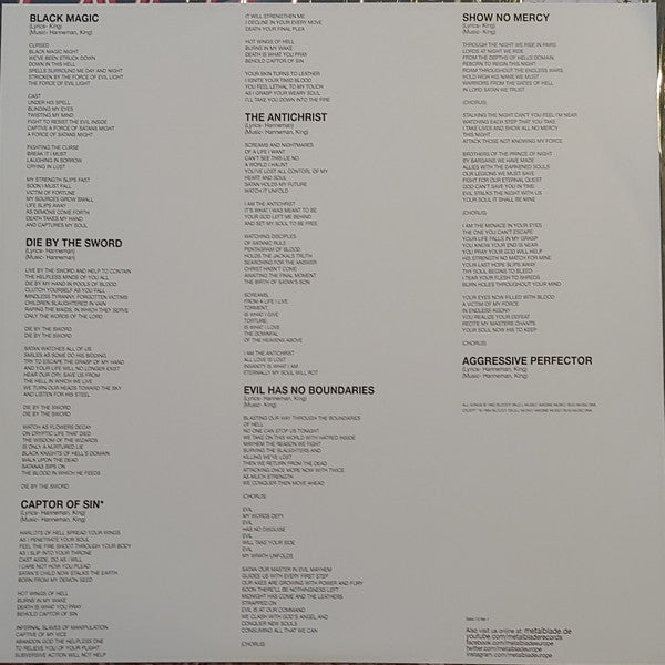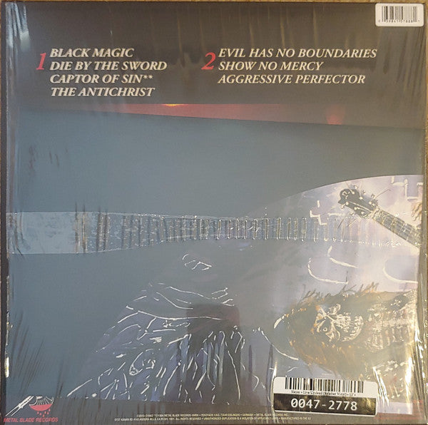 - The 2021 RI-versions: THIS ONE > clear / blood red splatter vinyl (US exclusive) limited to 500 copies; blue / white / black splatter vinyl (EU exclusive); blue / black split vinyl (US exclusive); grey / black marbled vinyl (US exclusive); blue / black splatter vinyl (EU exclusive – limited to 1000 copies) - Original artwork with 250g lyric/photo insert and large 60x60cm poster. - Vinyl is transparent blue / white & black splattered. - Remastered ... at Future Disc, November 1993 - Recorded live in New York City on their 1984 Haunting North America Tour © 2015 ℗1983 **℗1984 Manufactured in the EU Metal Blade Records Item #157888 Code: Slayer-Reissues-2021