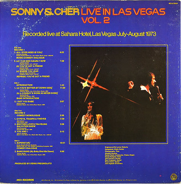 Auto-coupled release: LP1 holds sides A & D LP2 holds sides B & C Recorded live at Sahara Hotel, Las Vegas July-August 1973 On front sleeve: Sonny And Chér On labels: Sonny & Chér