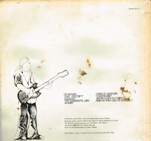 On the spine: FRAMMIS BZZ-77 STEVE TIBBETTS 0798 ---------------------------------------------------------------------------------------------- on back cover: frammis bzz-77 Instruments, tape effects, vocals and engineering by Steve Tibbetts "Recorded summer and fall 1976 at Der Studio D' Muzak Elechtronik, St. Paul Tim Weinhold played percussion on "The Secret" and "Desert" All selections ©℗1977 by Frammis Rekords Cover art and photomutation by Steve Tibbetts Don't forget to write: Frammis Ent. Box 6164 Minneapolis, MN 55406 Runouts etched except for stamped Wakefield Mfg logo