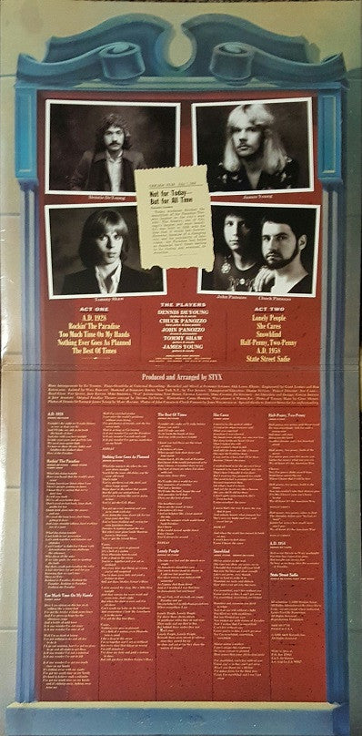 ℗ © 1980 A&M Records, Inc. Terre Haute Pressing with B Side only processed through [l214688. B Side - play area laser-etched, "STYX" logo, solid black label / no print. Gatefold cover is printed in reverse, with front to the left of spine and rear to right; includes poly inner sleeve. Recorded and Mixed at Pumpkin Studios, Oak Lawn, Illinois. All selections Published by Stygian Songs except B6 by First Time Music
