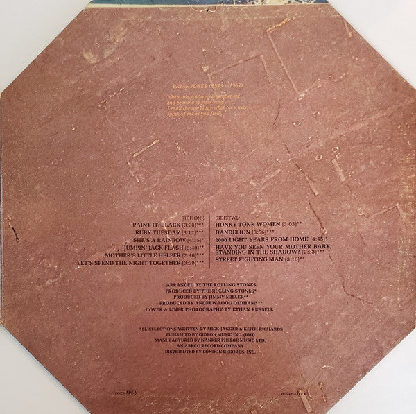 Terre Haute Pressing from Sterling and Bell Sound masters, with similar labels to these Pitman and Santa Maria pressings. Octagon shaped die-cut gatefold Liner includes Brian Jones (1943-1969) memoriam. Track B4 electronically re-recorded to simulate stereo.