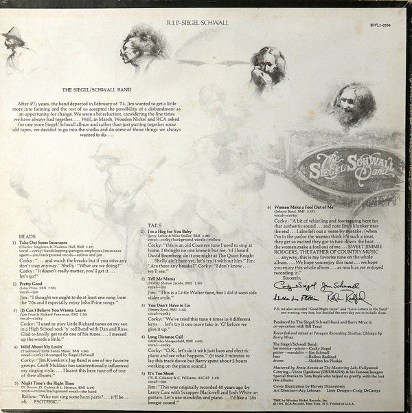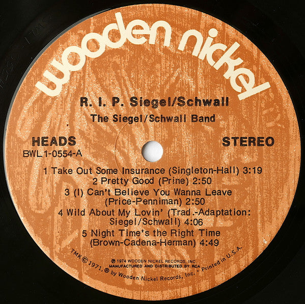 The Siegel/Schwall Band’s last album—so far. TMK by Wooden Nickel Records, Inc. © 1974, RCA Records, New York, N.Y. Printed in U.S.A.