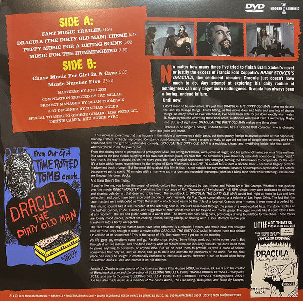 Includes Bonus DVD From out of a rotted tomb crawls the full score for the “film” Dracula (The Dirty Old Man)! Uncovered by archivist George Gimarc, these tapes, untouched for nearly 50 years and mislabelled "Sex Monsters," are finally dusted off, and you’ve never heard the music sound this good–the sound that made it into the film is an utter stake through the heart. Rumor has it that the audio from the original cut was so bad that they went back and redubbed everything (à la Woody Allen’s What’s Up, Tiger Lily?) to comedic effect. Who knew that buried under all that jabberwocky was a funk leaning jazz soundtrack that really grooves? This album comprises the highlights of the film score accompanied by audio cues believed to be Whit Boyd instructing the musicians in what was likely a live performance while watching the film.