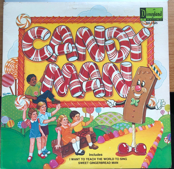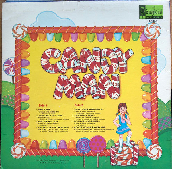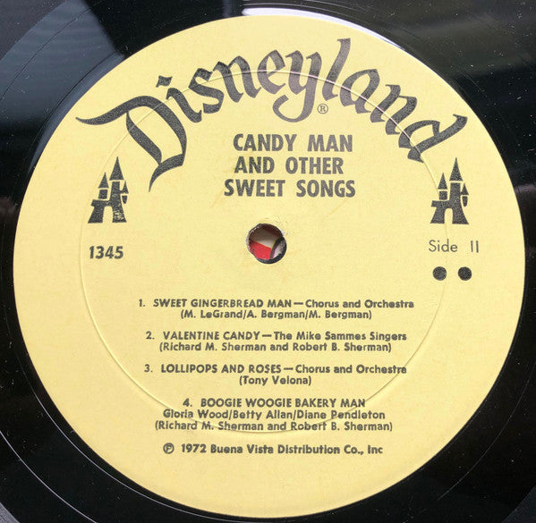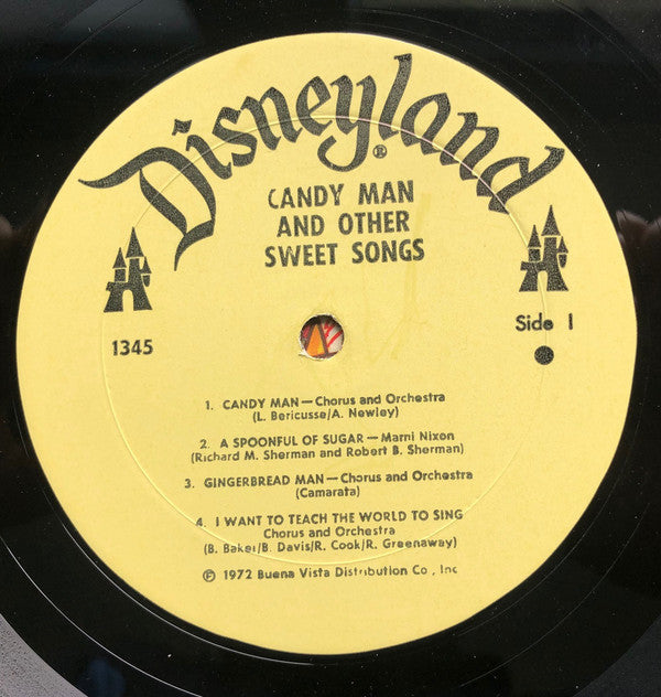 Pale yellow Disneyland Label. CANDY MAN AND OTHER SWEET SONGS on 3-lines, slight right under Disneyland logo. Sides 1 and 2 are identified by roman numerals and dots underneath the right castle. Cat # DQ-1345 is listed on the jacket, front and back, underneath Disneyland Record Cat # 1345 is listed on both side's labels, underneath the left castle. Track A4 is incorrectly credited to B. Baker on the label and cover. Unknown Artist is credited on the release as "Chorus And Orchestra" for all noted tracks.
