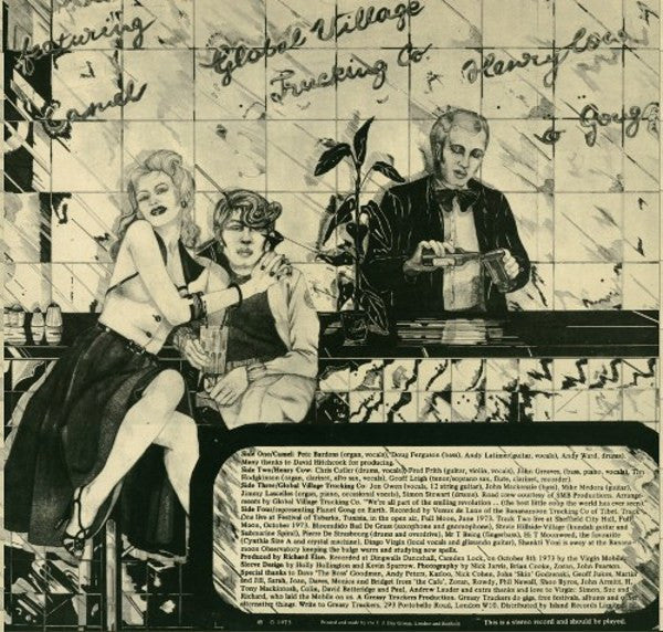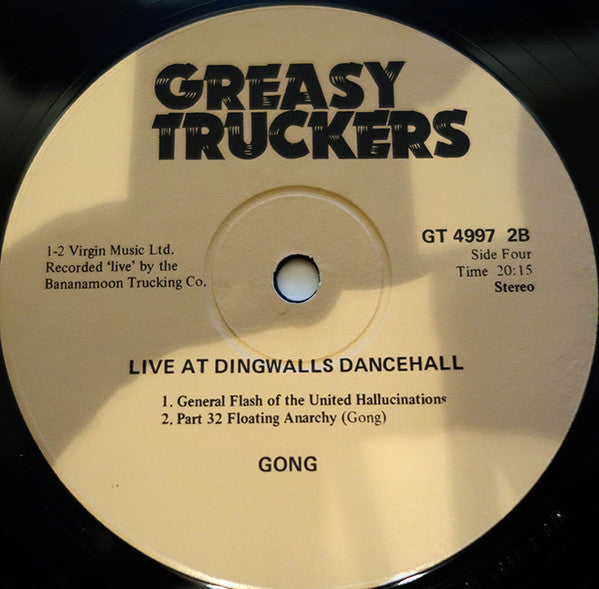 This is the 2nd/later pressing with the graphics inside the gatefold cover incorrectly positioned with the shoe on the right side (on the original, the shoe is on the left). Early versions include the insert, later versions did not. Sides A & C recorded at Dingwalls Dancehall, Camden Lock, on October 8th 1973 by the Virgin Mobile. Side B recorded at The Manor 4.11.73. All sounds on this side recorded 'live'. No special recording techniques or overdubs were used. Side D recorded by Venux de Luxe of the Bananamoon Trucking Co of Tibet. D1 live at Festival of Tabarka, Tunisia, in the open air, Full Moon, June 1973. D2 live at Sheffield City Hall, Full Moon, October 1973. "Shakti Yoni is away at the Bananamoon Observatory keeping the bulge warm and studying new spells." A Greasy Truckers Production. Greasy Truckers do gigs, free festivals, albums and other alternative things. Distributed by Island Records Limited. ℗ © 1973 Printed and made by the E. J. Day Group, London and Bedford This is a stereo record and should be played.